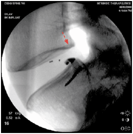 После операции при рентгенологическом контроле определяется положение Баррикада в области дефекта фиброзного кольца. Рис.7.