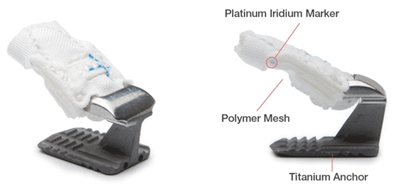Баррикад состоит из 2-х частей: гибкой полиэстеровой (полимерной) сетки, непосредственно закрывающей дефект фиброзного кольца и титанового якоря, имплантируемого в прилежащее к диску тело позвонка.