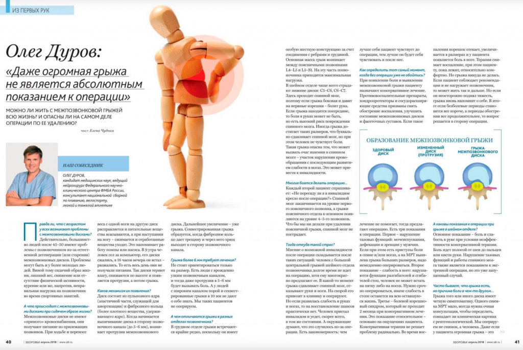 В журнале Здоровье №4 за апрель 2018 года вышла статья Олега Владимировича на тему межпозвонковой грыжи.