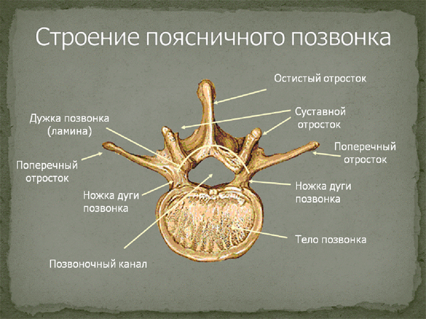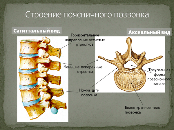 | Рис.3. Строение поясничного отдела позвоночника и поясничного позвонка. | Рис. 4 Строение поясничного позвонка (аксиальная проекция). |